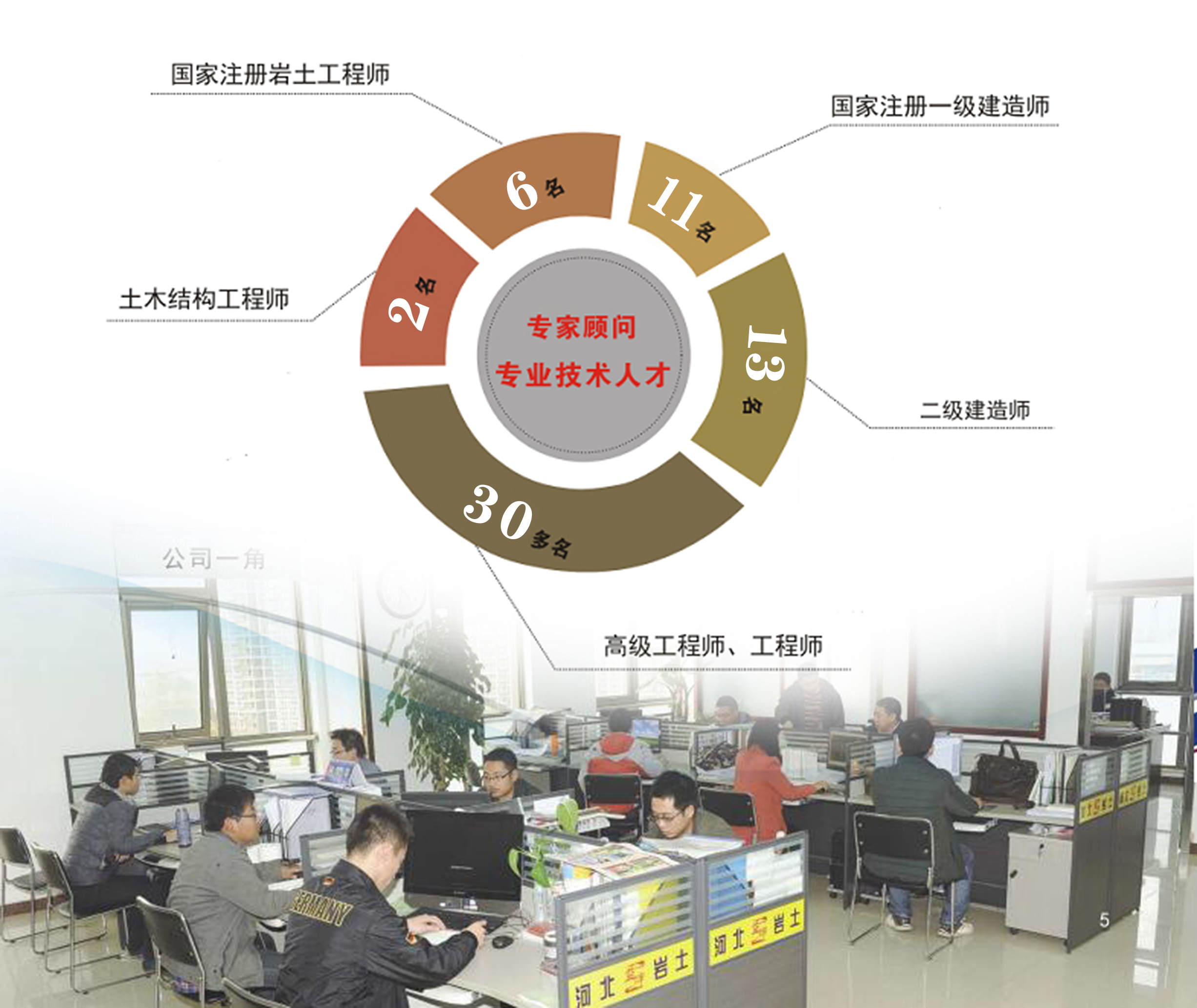 河北益坤在岩土工程领域已发展十余年、起点高,业务精,技术力量雄厚,人才结构合理。拥有国家注册岩土工程师6名、国家注册一级建造师11名,二级建造师13名,注册造价师1名、高级工程师、工程师30多名,土木结构工程师2名。主要技术人员多年来一直从事岩土工程勘察、设计、治理等工作,具有丰富的岩土工程专业技术知识和管理工作经验。