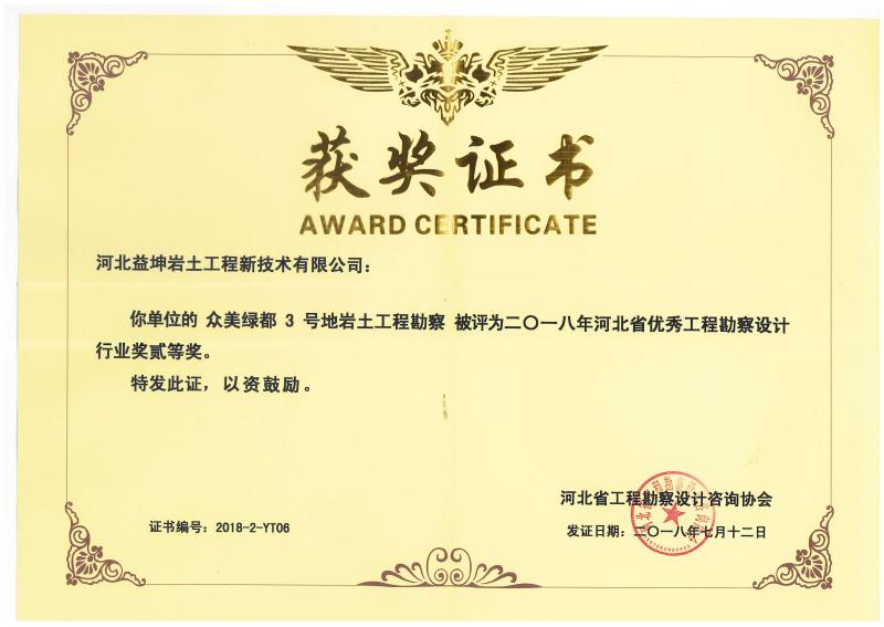 喜讯传来!“众美绿都3号地”项目的勘察成果获“河北省工程勘察设计协会”颁发的省级二等奖!