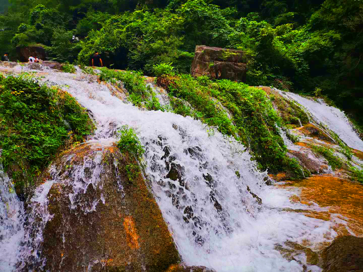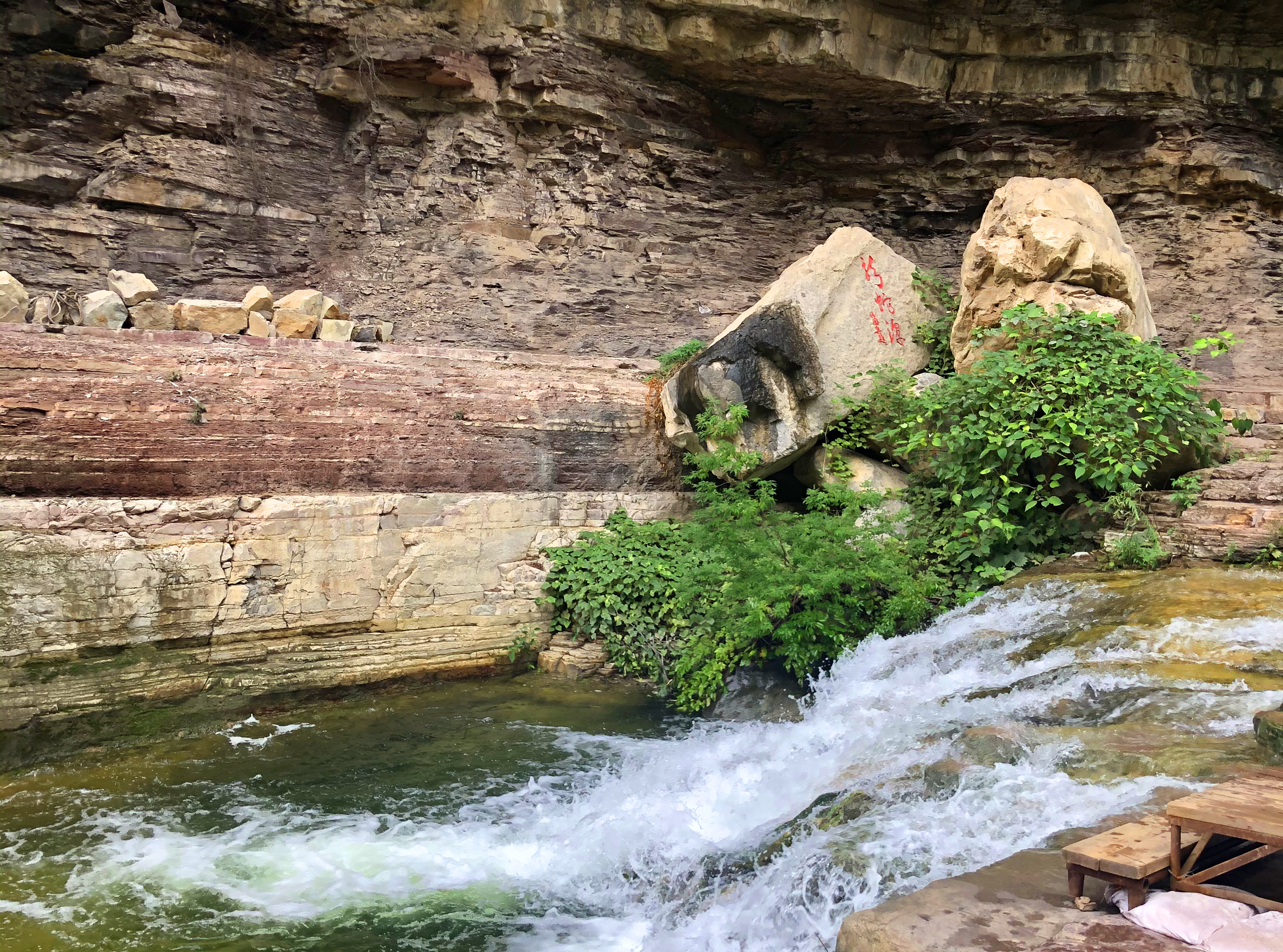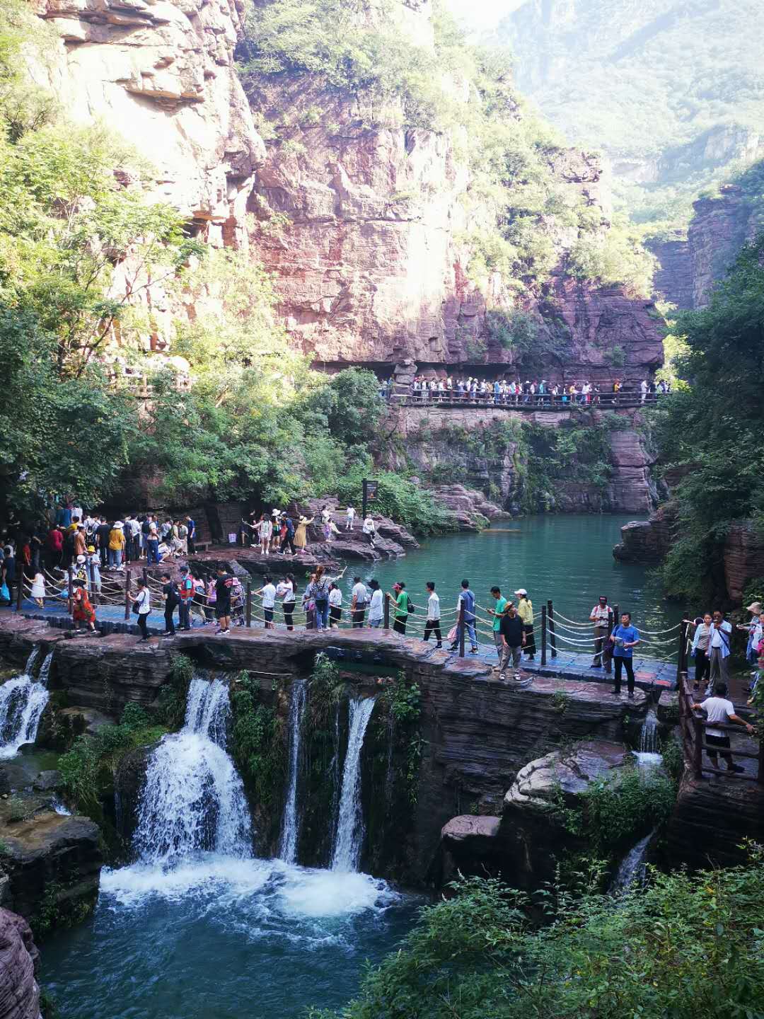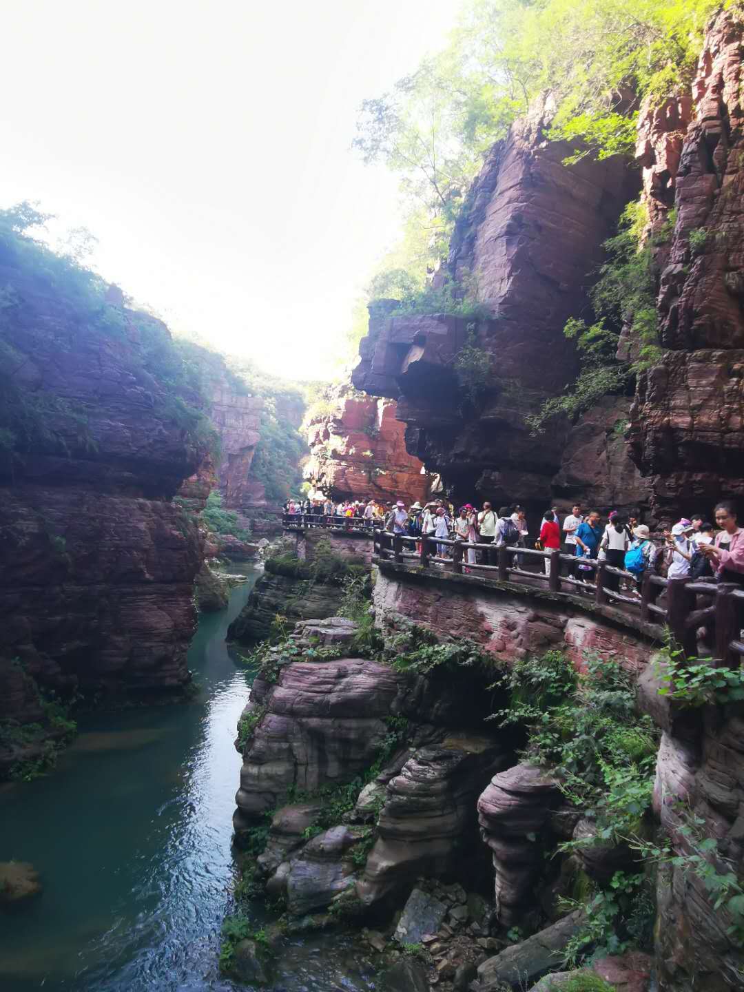 云台山--茱萸峰合影 DAY 2 【红石峡景区】 红石峡景区——云台山第一景观之称,享有“盆景峡谷”之美誉,被园林家称之为“自然山水精品画廊”。欣赏这集秀、幽、雄、险于一身,泉、瀑、溪、潭于一谷的景观。沿途峡谷风光尽收眼底 ,两岸峭壁山石秀丽,仿佛鬼斧神工雕凿而成。不经想到明代怀庆知府徐以贞的诗:何年鬼斧劈层崖,鸟翼飞来一线开。斜阳在山归意懒,不堪回首重徘徊。