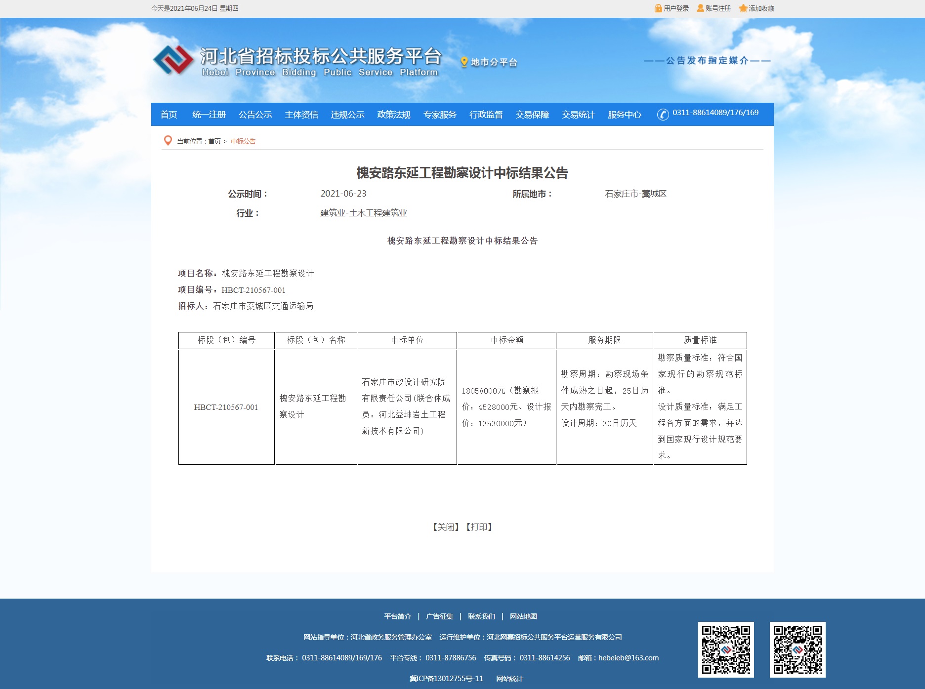“槐安路东延工程”位于河北省石家庄市藁城区,全长约13公里,中标金额为4528000. 本项目位于石家庄市主城区以东,藁城区以西,起点为东三环,终点跨越藁城西环后顺接廉州西路,道路与东三环、工业大街、塔元街、新赵线、京港澳高速以及藁城西环等重要道路相交,全长约 13 公里。工程详细勘察察(含钻勘、技术资料、后期服务等)的全部内容和本工程所涉及到的施工图设计及相关服务。 此次两个项目的顺利中标,不仅展现了我公司在道路桥梁上的专业实力,同时也为企业战略实施迈向坚实的一步。 |