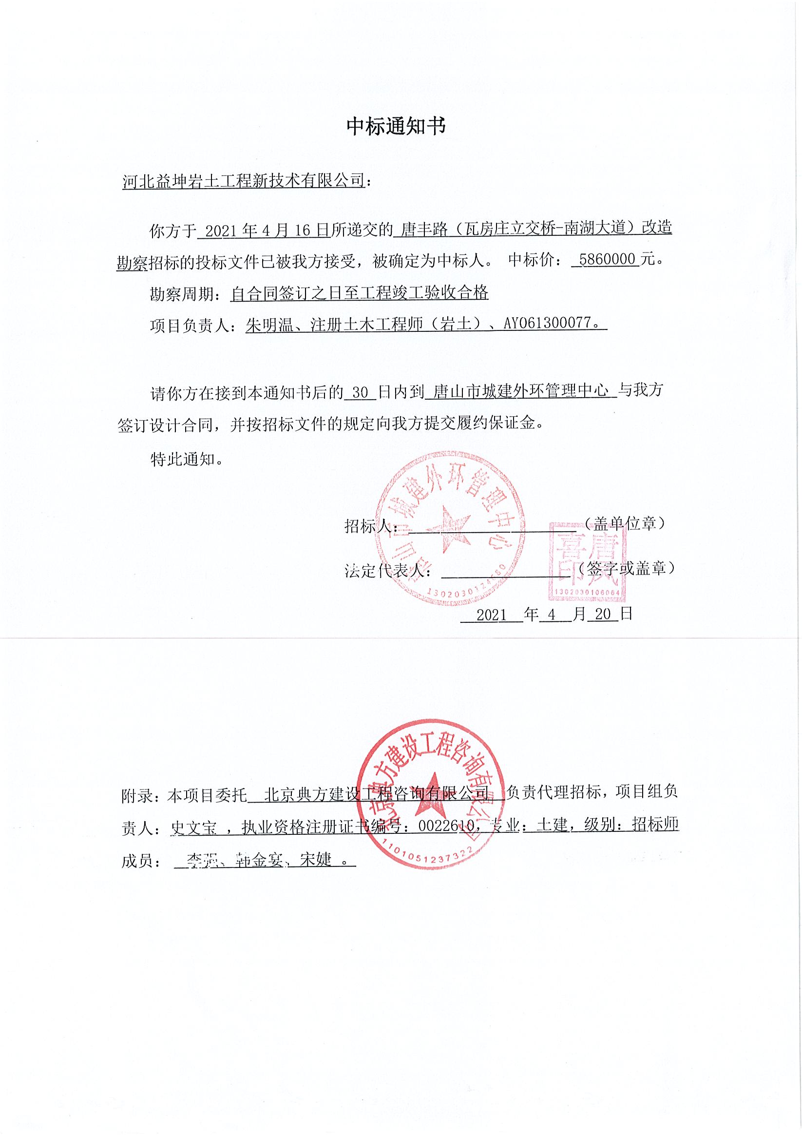 唐丰路(瓦房庄立交桥-南湖大道)改造勘察项目位于河北省唐山市,北起瓦房庄立交桥,南至唐丰路与南湖大道交叉口,全长约8.2公里。中标金额为5860000.00元。 该项目工程规模、特征,北起瓦房庄立交桥,南至唐丰路与南湖大道交叉口,全长约8.2公里。道路红线宽60米,总投资约15.5亿元。建设内容包括并不限于道里工程、交通 工程、给排水工程、照明工程等。