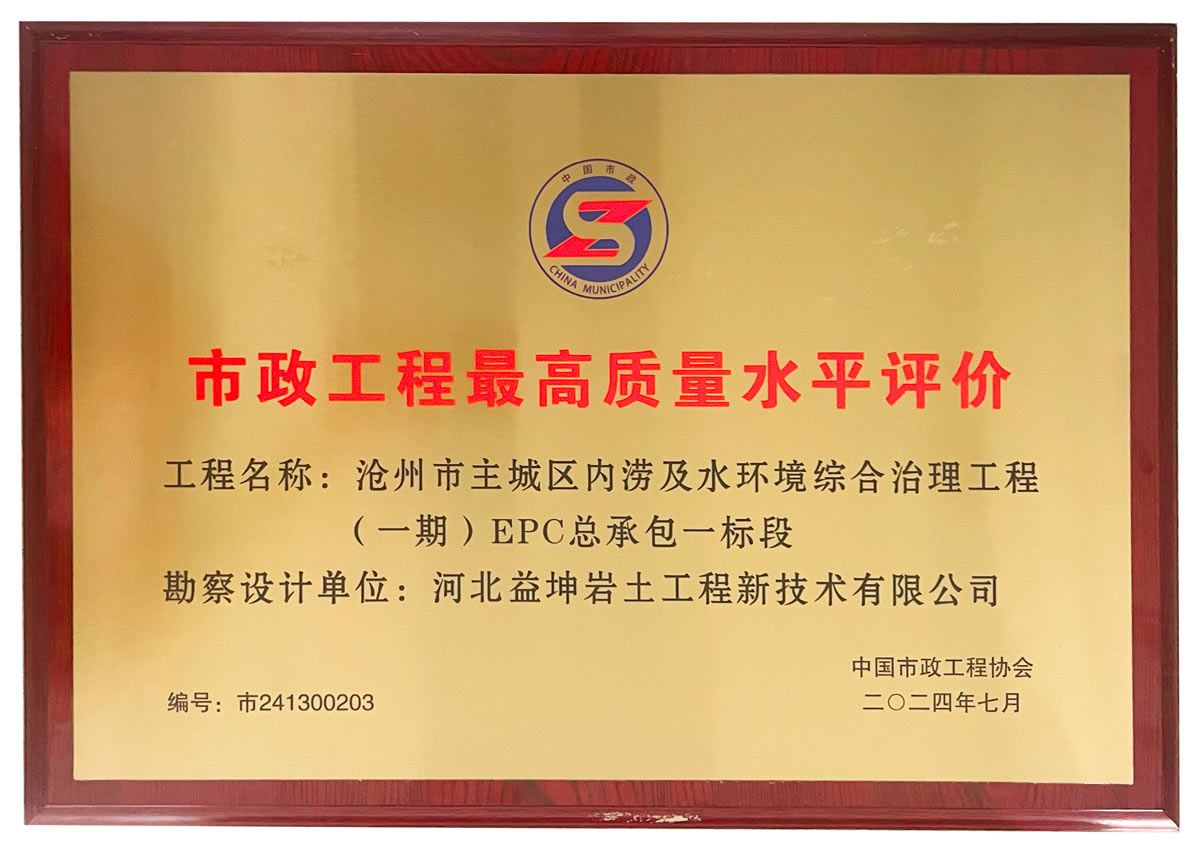 在中国市政工程协会公布的“2024年度通过市政工程最高质量水平评价工程名单”中,由益坤公司承接勘察及设计的“沧州市主城区内涝及水环境综合治理工程(一期)EPC总承包一标段”工程荣获“2024年度中国市政工程最高质量水平评价”。 市政工程最高质量水平评价由中国市政工程协会组织实施。该奖项代表市政工程行业同时期国内先进水平,是我国市政工程行业在工程质量方面的最高质量水准评价,也是中国市政工程协会的最高荣誉。 沧州市主城区内涝及水环境综合治理工程(一期)EPC总承包一标段位于河北省沧州市,是沧州市重点民生工程之一。主要施工内容包括东部主城区泵站扩容改造提升及配套下游改造、易积水点改造、小区街巷雨污水改造治理等。 项目建设期间,公司勘察组严格执行国家规范和技术标准,加强施工组织和过程管控,优化勘察方案,紧盯时间节点,有效保障项目高质量竣工。